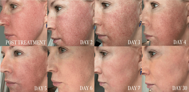 Within about an hour, the intense heat subsided, though my skin still felt warm. Swelling started soon after, which was expected. What surprised me most was seeing the tiny channels (essentially holes) all over my skin, with a bit of pinpoint bleeding. It’s wild to see, but also fascinating. I mean…the things we do for beauty!