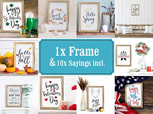 Rustic Wall Decor Set W/ 10 Design Options: Kibaga brings on the inspirational & seasonal vibes with 10 lovely design options that give you the opportunity to switch sayings whenever you like to! Set incl. one rustic wooden frame (w/o glass), 5 reversible prints with 4 joyful artworks for spring, summer, fall, Christmas, Easter, Valentines day, St. Patricks day, 4th July & 2 letterings