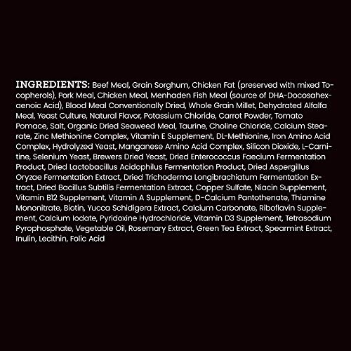 Beef Meal, Grain Sorghum, Chicken Fat (preserved with mixed Tocopherols), Pork Meal, Chicken Meal, Menhaden Fish Meal (source of DHA-Docosahexaenoic Acid), Blood Meal, Whole Grain Millet, Dehydrated Alfalfa Meal, Yeast Culture, Natural Flavor, Potassium Chloride, Carrot Powder, Tomato Pomace (source of Lycopene), Taurine, Salt, Choline Chloride, Dried Seaweed Meal, Zinc Methionine Complex, Vitamin E Supplement, Hydrolyzed Yeast, Iron Amino Acid Complex, Calcium Carbonate, Manganese Amino Acid Complex, Ferrous Sulfate, L-Carnitine, Selenium Yeast, Copper Sulfate, Niacin Supplement, Vitamin B12 Supplement, D-Calcium Pantothenate, Vitamin A Supplement, Thiamine Mononitrate, Biotin, Riboflavin Supplement, Calcium Iodate, Pyridoxine Hydrochloride, Vitamin D3 Supplement, Powdered Cellulose, Brewers Dried Yeast, Dried Enterococcus Faecium Fermentation Product, Dried Aspergillus Oryzae Fermentation Extract, Dried Trichoderma Longibrachiatum Fermentation Extract, Dried Bacillus Subtilis Fermentation Extract, Silicon Dioxide, Tetra Sodium Pyrophosphate, Vegetable Oil, Rosemary Extract, Green Tea Extract, Spearmint Extract, Lecithin, Fructooligosaccharide, Folic Acid, Yucca Schidigera Extract.